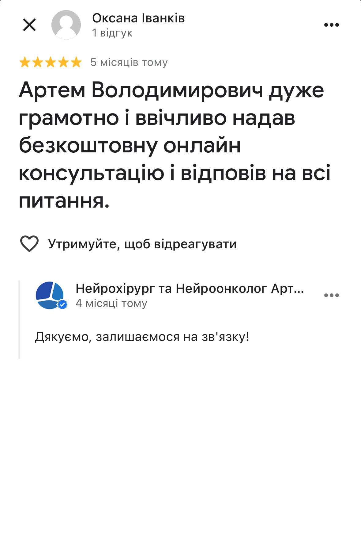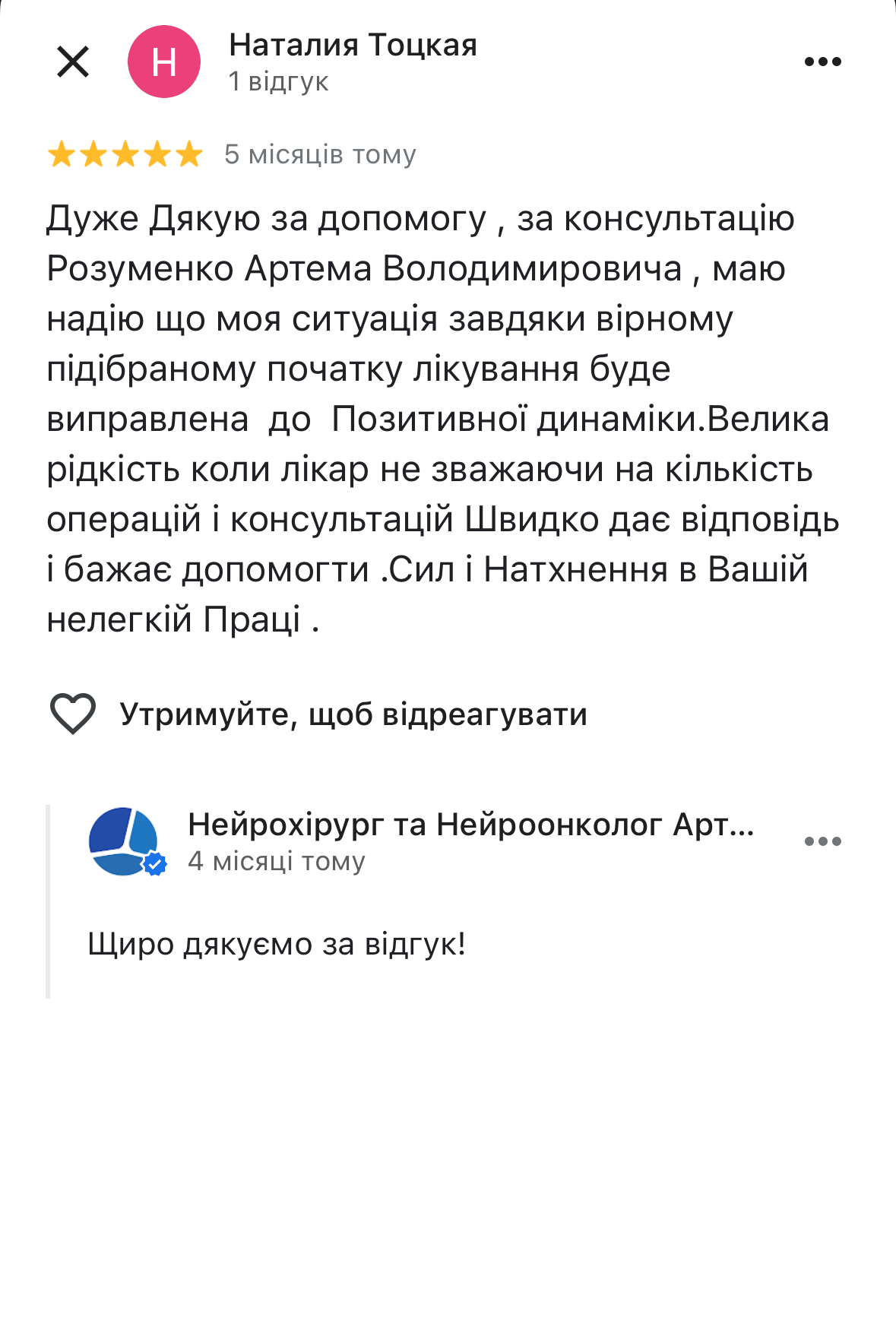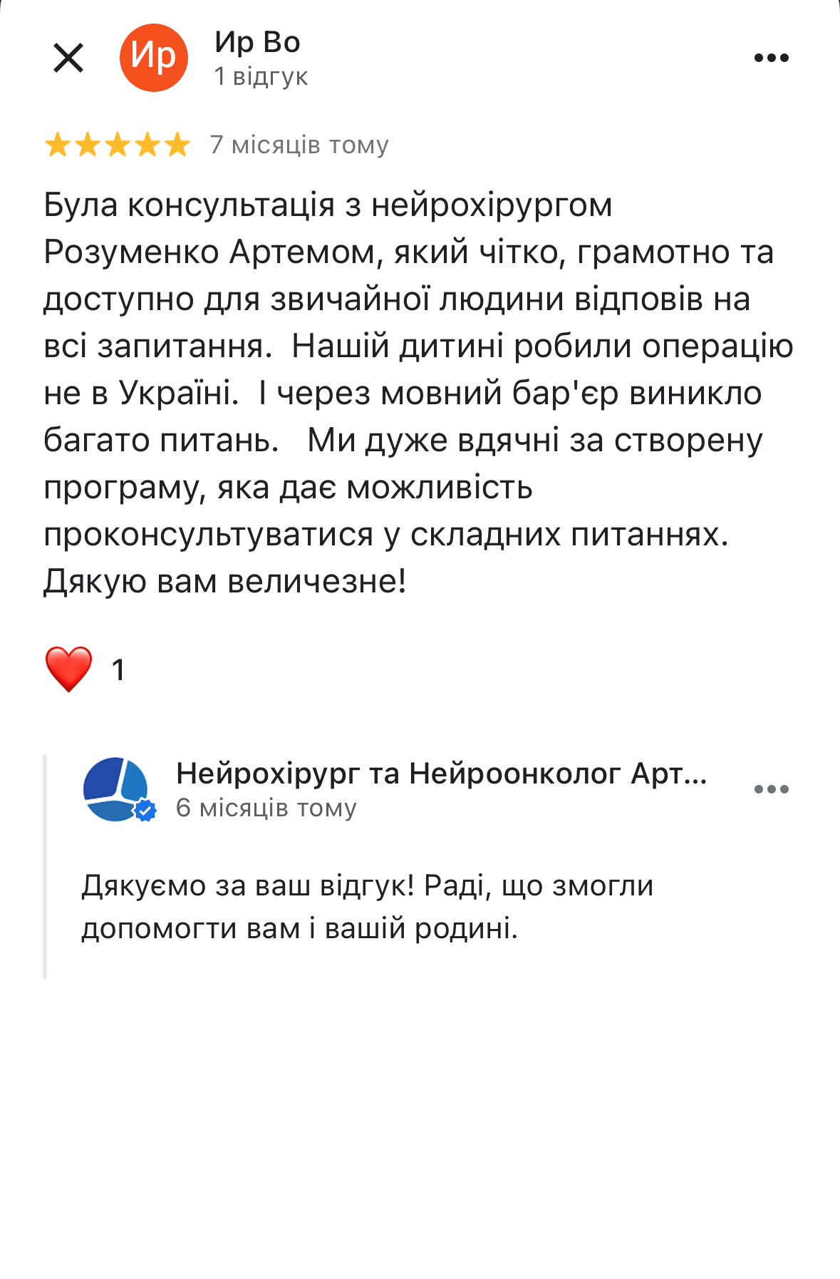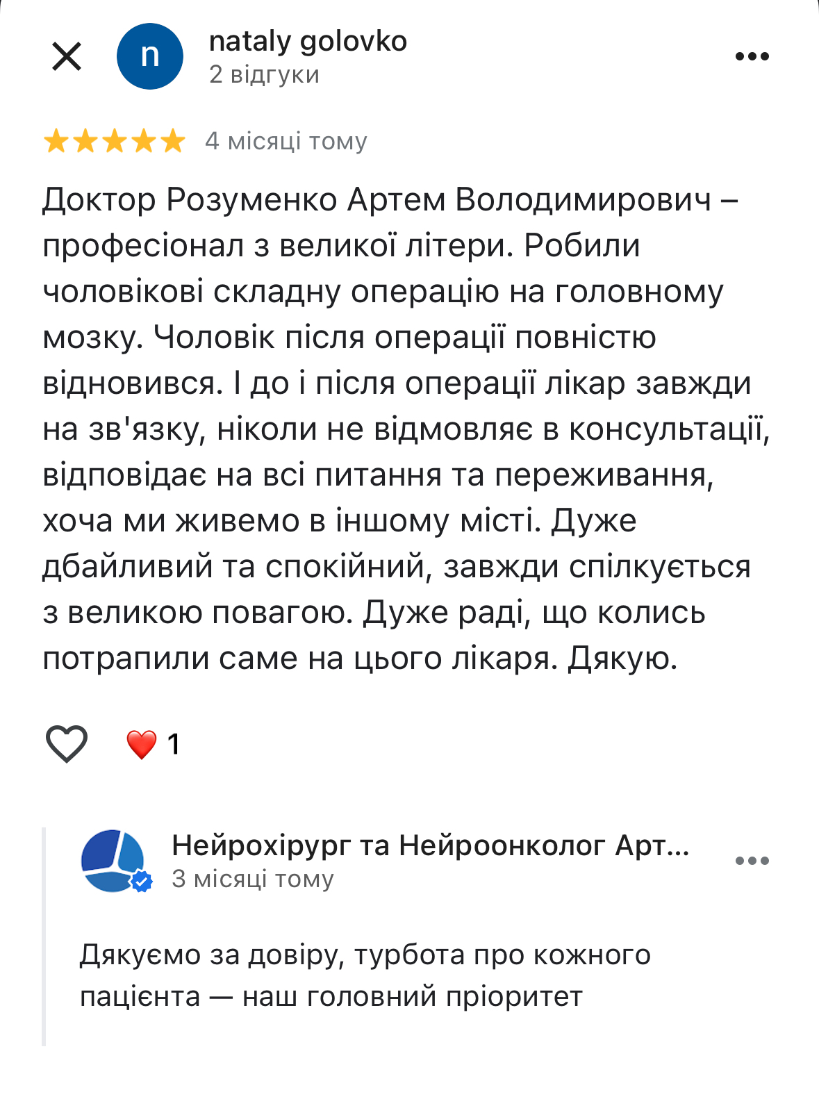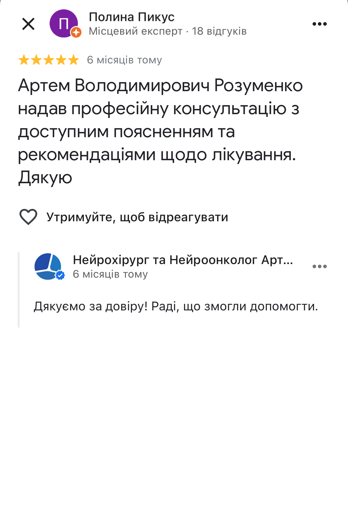 «Ми працювали на міліметри. Але завдяки нейронавігації та точному плануванню — пацієнтка говорить, рухається і повертається до життя вже наступного дня після операції.»Сучасні технології дозволяють оперувати навіть у критично важливих ділянках мозку — без втрати функцій. Головне — діяти вчасно. Можлива консультація в Києві або онлайн. Зв’яжіться з лікарем — без зайвого стресу.