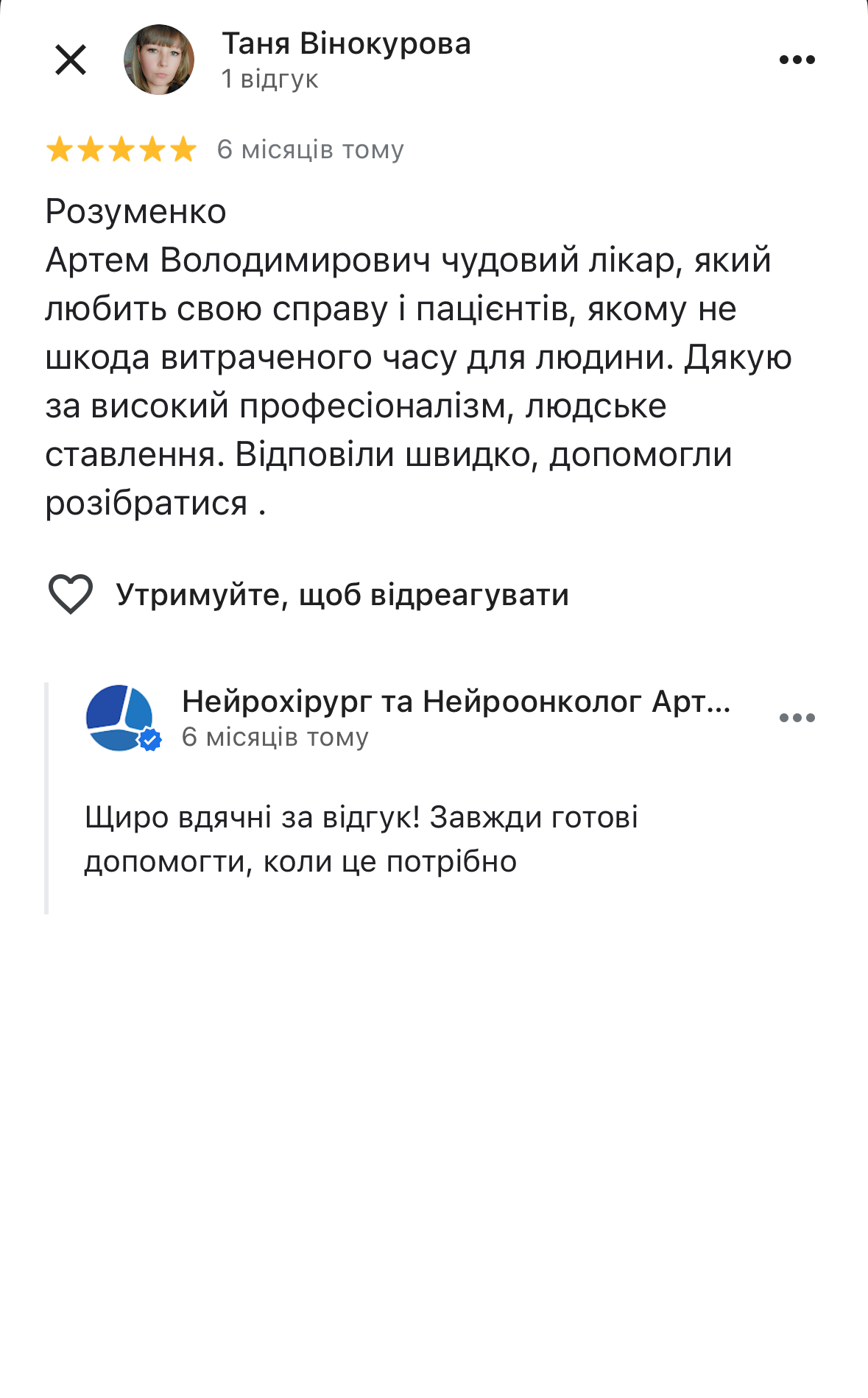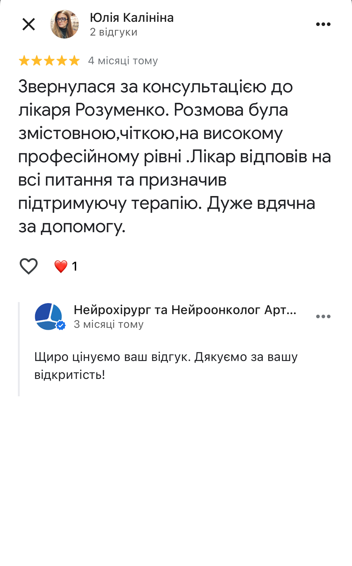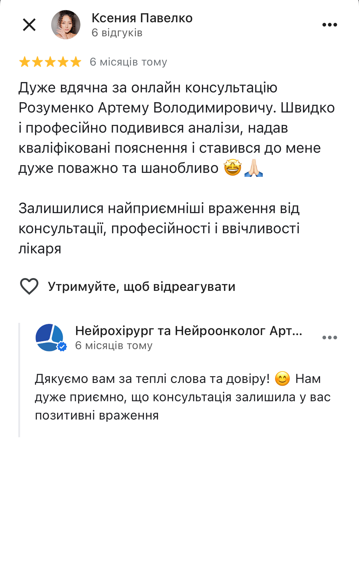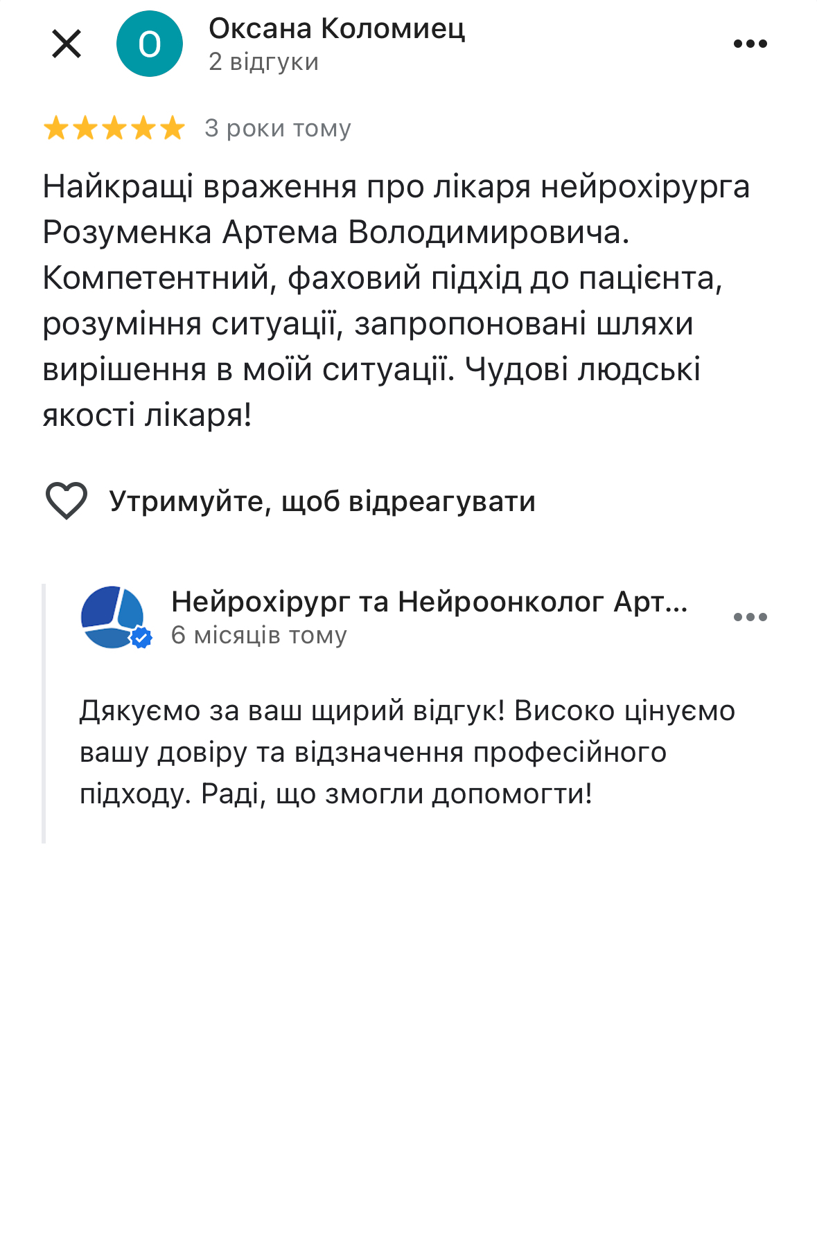 «Ми працювали на міліметри. Але завдяки нейронавігації та точному плануванню — пацієнтка говорить, рухається і повертається до життя вже наступного дня після операції.»Сучасні технології дозволяють оперувати навіть у критично важливих ділянках мозку — без втрати функцій. Головне — діяти вчасно. Можлива консультація в Києві або онлайн. Зв’яжіться з лікарем — без зайвого стресу.